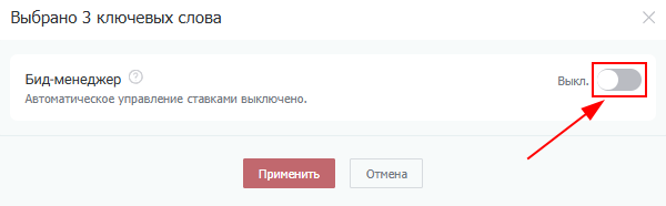 2. В кампании должна быть включена ручная стратегия управления ставками. Функция не будет работать при автоматических стратегиях.