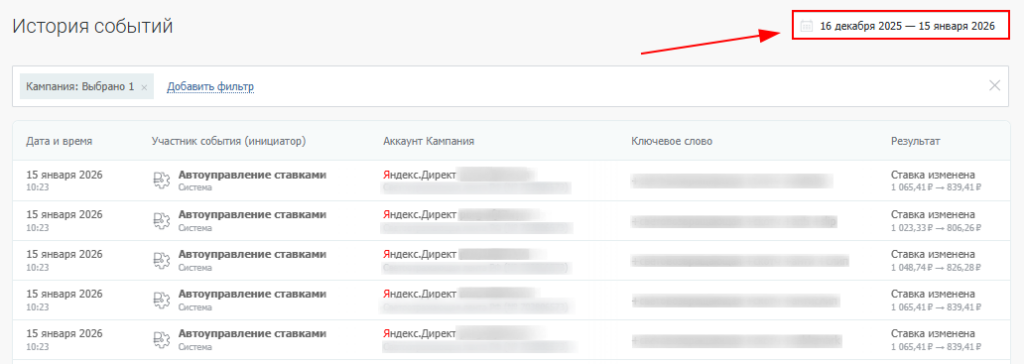 В списке кампаний вы увидите заданные параметры управления ставками. Система будет обновлять ставки каждые 60 минут и назначать цену входа на нужную позицию с корректировкой для каждой ключевой фразы.