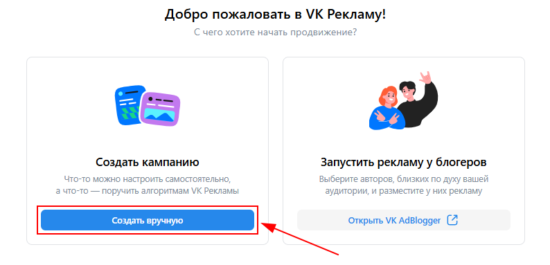 2. На главной странице нажмите на кнопку «Создать кампанию вручную».