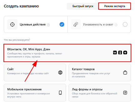 3. В появившемся окне перейдите в режим эксперта и выберите «Вконтакте, ОК, MiniApps, Дзен».