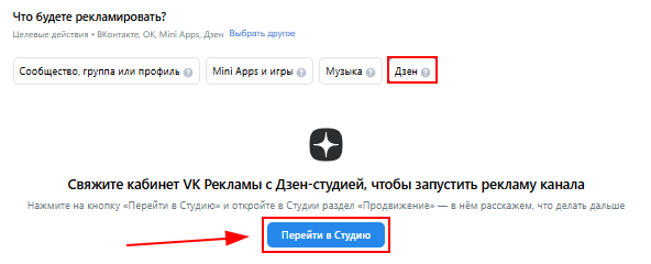 4. Выберите «Дзен», затем нажмите на кнопку «Перейти в Студию», вы будете перенаправлены на страницу в Дзене. Перед переходом проверьте в каком аккаунте Дзен вы авторизованы.