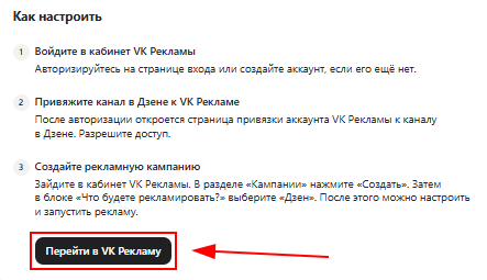 5. На этом шаге нужно связать кабинет VK Реклама и аккаунт в Дзен. Нажмите на «Перейти в VK Рекламу».