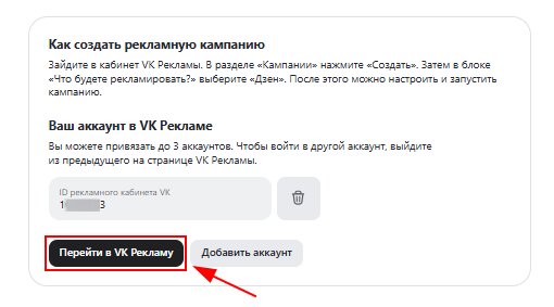 Важно! К одному аккаунту в Дзен можно привязать до 3 кабинетов в VK Рекламы.
