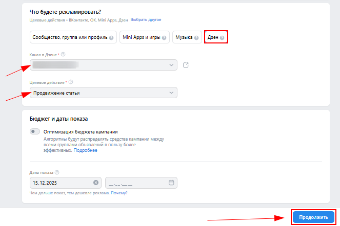 Повторите шаги 2-4, после этого выберите канал для продвижения, целевое действие, даты проведения рекламной кампании, затем нажмите «Продолжить».