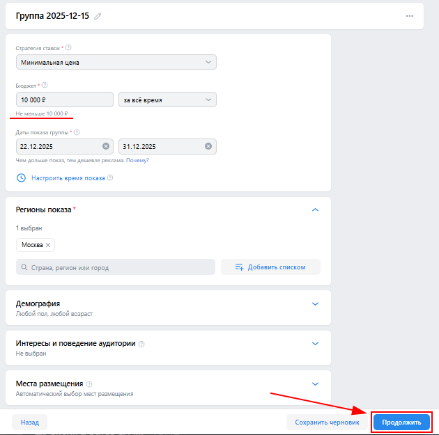 9. Настройте параметры рекламной кампании. Обратите внимание, что минимальный бюджет для запуска — от 10 000 руб.