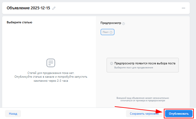 10. На следующем шаге выберите статью для продвижения и запустите кампанию.
