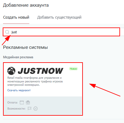 2. Используя поле для поиска найдите и выберите площадку «Justnow».