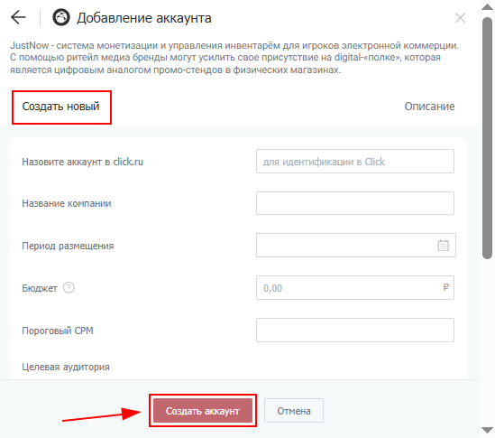 3. Назовите новый аккаунт и заполните необходимые поля, затем нажмите на кнопку «Создать аккаунт».