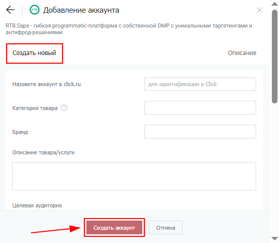 3. Назовите новый аккаунт и заполните необходимые поля, затем нажмите на кнопку «Создать аккаунт».