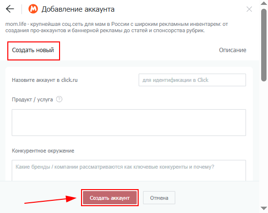 3. Назовите новый аккаунт и заполните необходимые поля, затем нажмите на кнопку «Создать аккаунт».