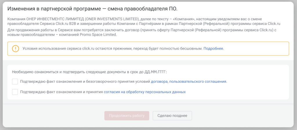 Для продвижения работы в Сервисе пользователям необходимо заключить договор (принять оферту Партнерской (Реферальной) программы сервиса Click.ru) с новым правообладателем – компанией Promo Space Limited. При входе в мастер аккаунт все пользователи увидели всплывающее окно с предложенными действиями.