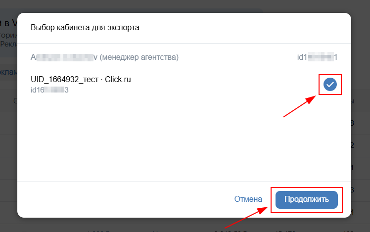 Выберите кабинет, в который желаете перенести кампании, и нажмите кнопку «Продолжить».