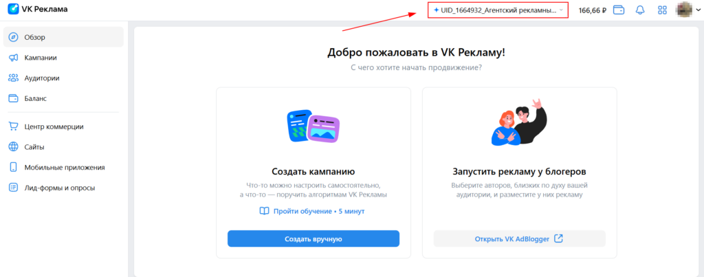 Для управления настройками потребуется основной кабинет, который необходимо создать напрямую в сервисе VK Реклама.