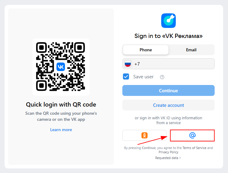 1. Войдите в ваш аккаунт VK ID любым удобным способом на сайте https://ads.vk.com, например, через электронную почту.