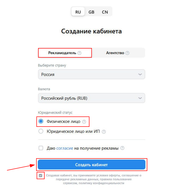 2. Если ваш VK ID новый в системе VK Реклама, откроется форма создания кабинета. Выберите: