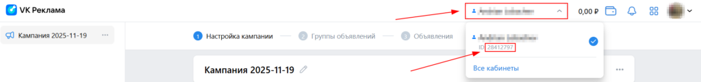 3. В правом верхнем углу интерфейса VK Рекламы нажмите на название кабинета и скопируйте его ID.