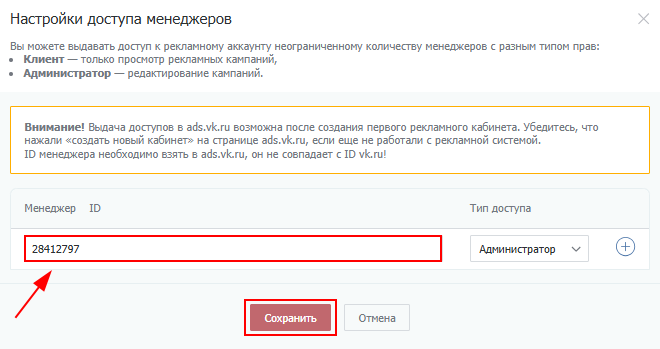 5. Вставьте ID вашего мультиаккаунта в специальное поле, выберите тип доступа «Администратор» (это позволит создавать и настраивать кампании) и нажмите кнопку «Сохранить».