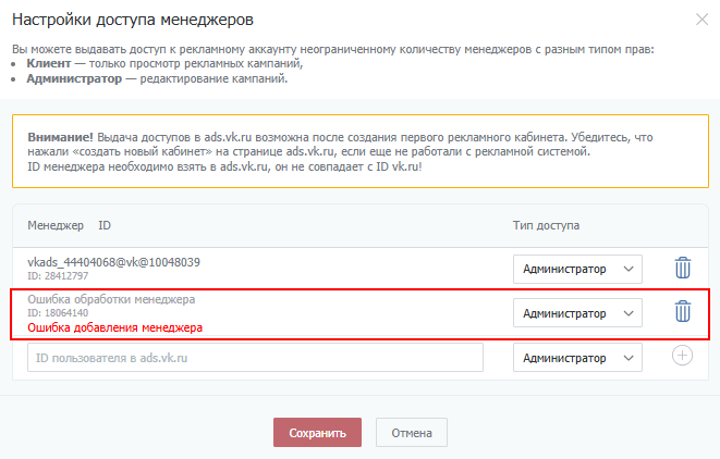 Если при добавлении доступа возникает ошибка добавления менеджера, рекомендуется создать новый мультиаккаунт.