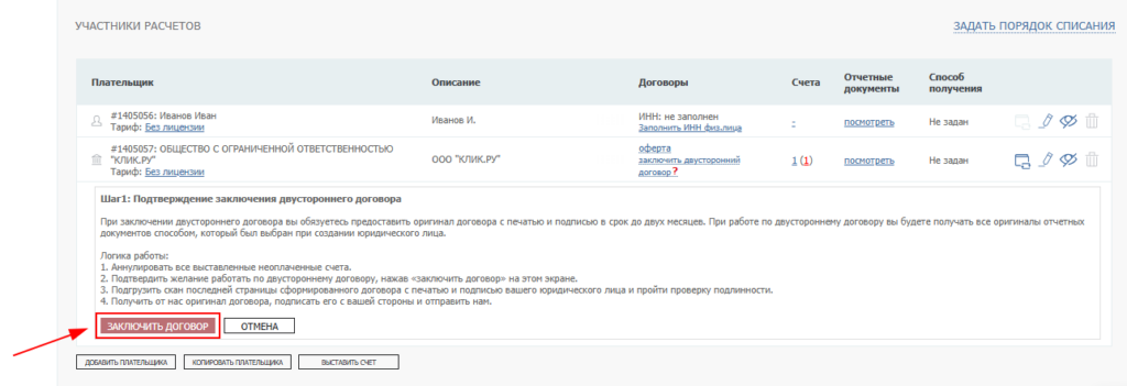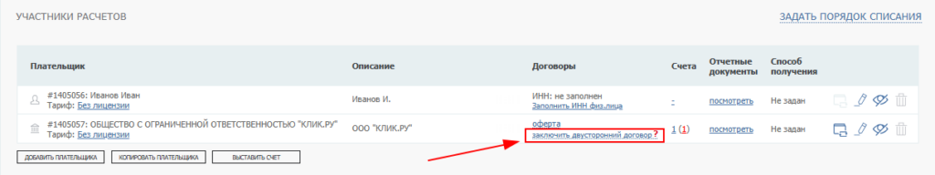 Напротив юр. лица или ИП, с которым вы хотите заключить договор, перейдите по ссылке «заключить двусторонний договор» и пройдите несколько шагов.