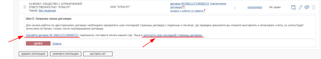 Далее следует распечатать договор, на последней странице поставить подпись и печать организации, отсканировать эту страницу и загрузить ее в систему через форму, которая доступна по ссылке «загрузите скан последней страницы договора».