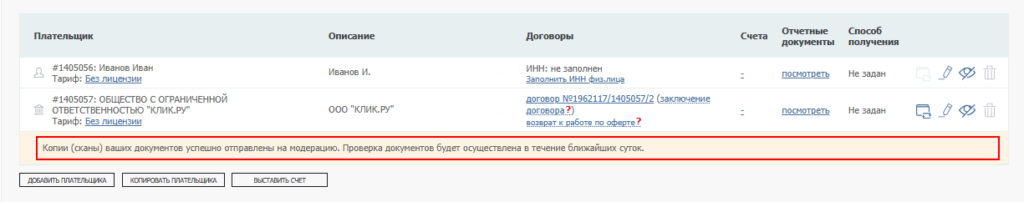 Если вы полностью уверены в правильности внесенных данных, отправленных на модерацию, вы можете выставить и оплатить счет (к моменту поступления денег внесенные документы уже будут проверены).