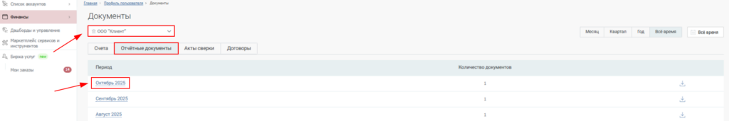 2. Находясь на странице «Документы», выберите плательщика, перейдите во вкладку «Отчетные документы» и нажмите на интересующий вас период (например, «Октябрь 2025»).