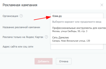 Выберите организацию, которую будете рекламировать. Если не нашли организацию, то добавьте ее в Яндекс.Справочник.