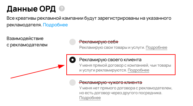 4. Выберите «Рекламирую своего клиента», если рекламу будет оплачивать конечный рекламодатель;