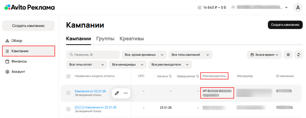 После сохранения черновика вы можете перейти на страницу со списком кампаний и убедиться, что верно указали конечного рекламодателя.