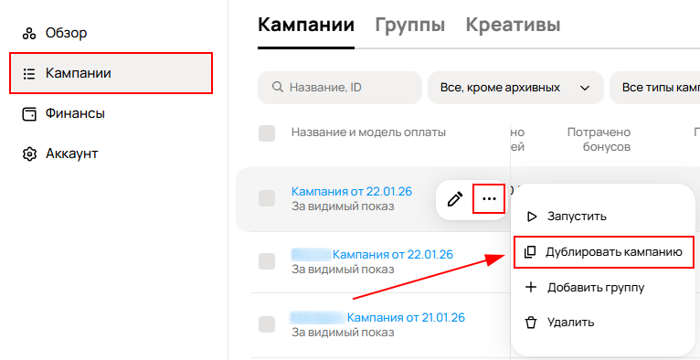 Если у вас уже есть кампания с заполненной маркировкой вы можете дублировать эту кампанию, для этого перейдите список кампаний, раскройте меню настройки, нажав на значок с тремя точками, и нажмите на «Дублировать кампанию». Так вы создадите черновик, в котором уже будет заполнена маркировка.